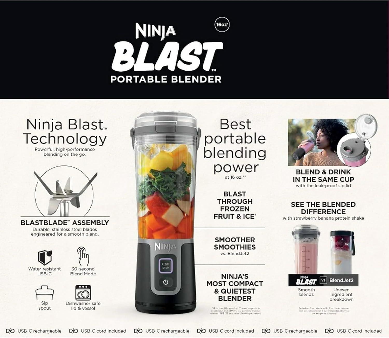 The Ninja Blast Portable Blender brings high-speed Ninja blending power on the go with a cordless, hand-held design. The 16-oz. vessel is perfect for smoothies, protein shakes, and frozen drinks. Blast through frozen ingredients with Ninja’s BlastBlade Assembly. Ninja Blast is rechargeable via USB-C. One-handed, easy-open sip lid and carrying handle make drinking on the go easier than ever.