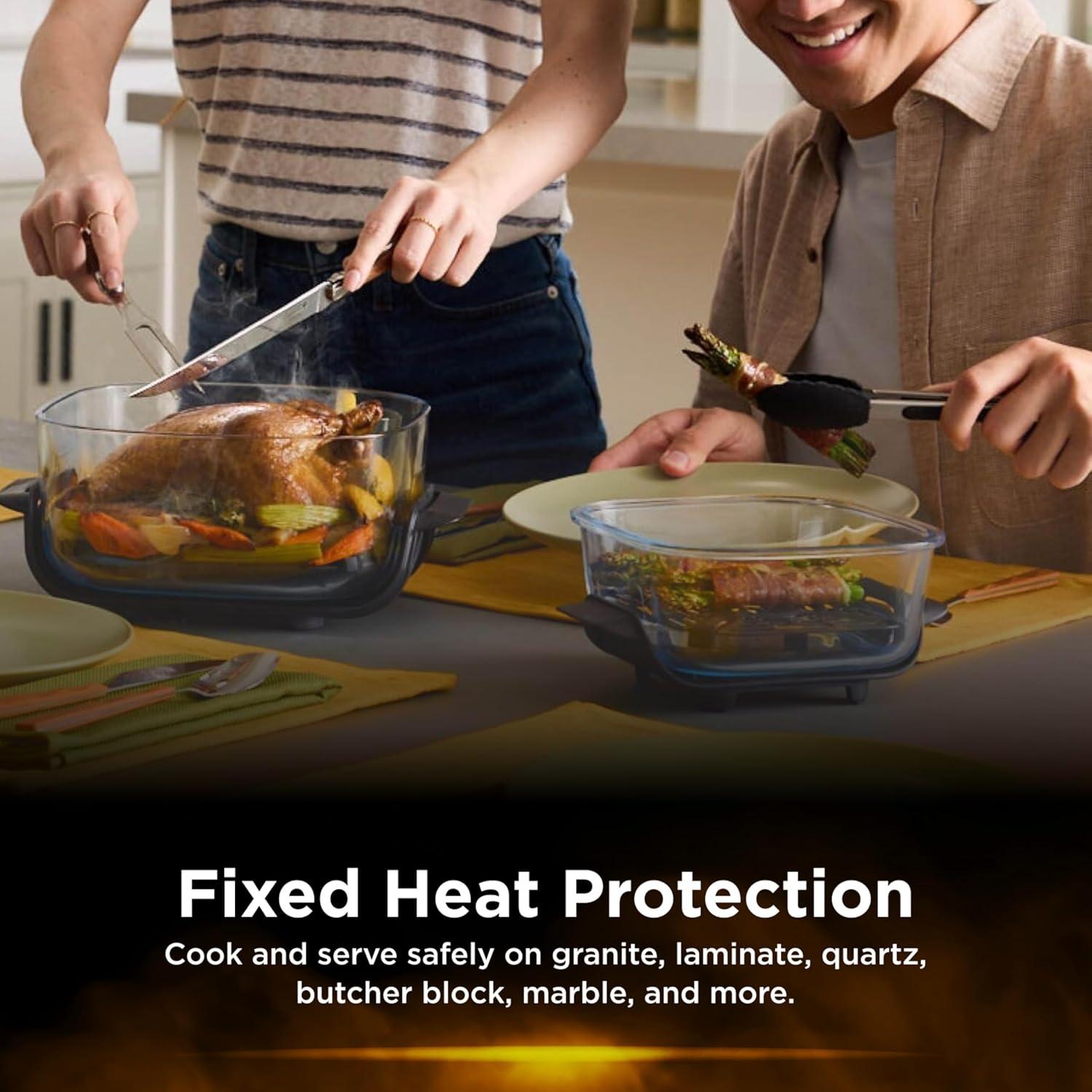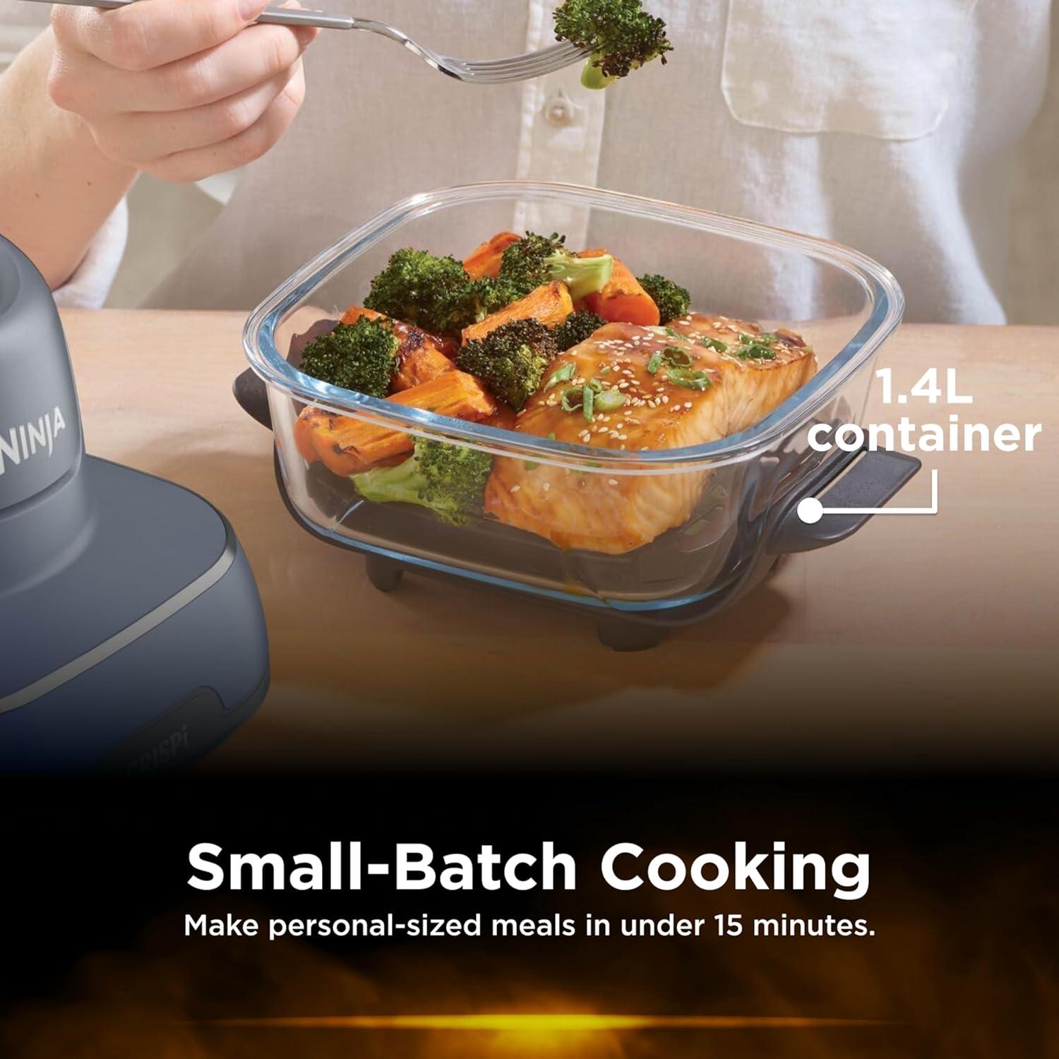 Prep, crisp, serve and store with this super-convenient cooker that packs the power of a full-sized air fryer into a portable design that switches from big- to small-batch cooking. The Crispi Power pod snaps onto either the 6-cup or 4-quart container and use superheated air to crisp, bake, air fry or recrisp foods. The glass containers are thermal shock-resistant and feature built-in stands with easy-carry handles and heat-safe feet to protect surfaces. Snap-on Crispi PowerPod provides superheated air with 1,500 watts of power. Heats up to 450 Degree F for perfect crisping. 4-in-1 functionality: Max Crisp, Bake, Air Fry and Recrisp. Handled containers have heat-safe feet to protect counter surfaces. 2 leakproof, snap-lock plastic lids. Aluminum crisper plates with nano-ceramic coating. Timer function. Auto-shutoff. Pod and containers nest for space-saving storage. 36-inch black cord. Dishwasher-safe containers, crisper plates, adapter and lids. Aluminum, stainless steel, glass and plastic construction. Set: Crispi PowerPod, 2 TempWare containers, 2 storage lids, 2 crisper plates, 1 container adapter and small lid. Ninja Crispi 4-in-1 Portable Glass Air Fryer Cooking System in Cyberspace measures 13.5-inch height, 13.3-inch width and 11.9-inch depth.