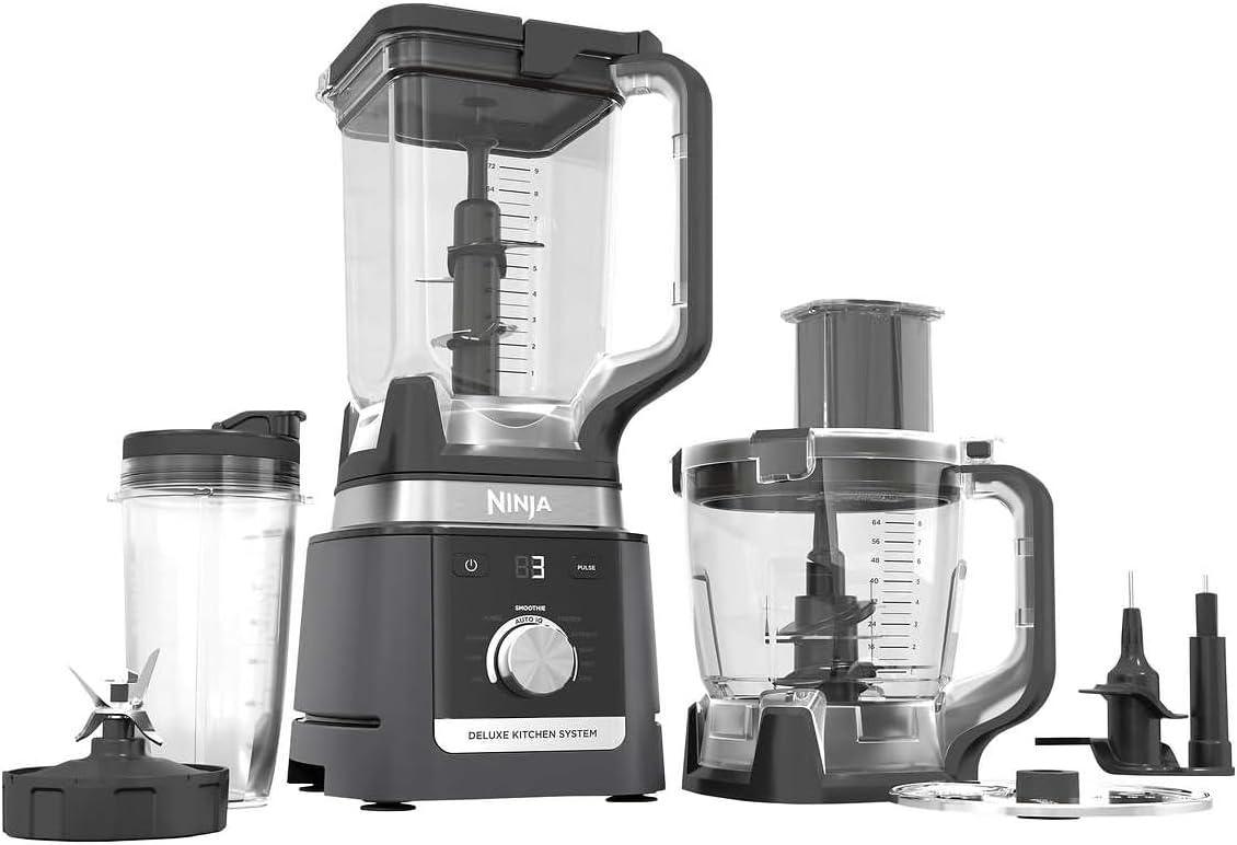 Transform your kitchen experience with Ninja's largest Kitchen System, a versatile powerhouse designed to handle everything from drinks and dips to desserts and more. Featuring innovative Auto-iQ technology, this deluxe system puts your favorite culinary creations at the touch of a button. The 4-in-1 functionality lets you CRUSH fruits and ice for smoothies and frozen drinks, EXTRACT nutrients from whole fruits and vegetables, CHOP & MIX ingredients for fresh salsas and dough, and SLICE & SHRED produce with precision. With a generous 2.6L (88 oz) pitcher, 710ml personal cup, and 2.1L food processor bowl, this 1600-watt system offers 20% more capacity than standard models. The intuitive control panel features 7 pre-programmed settings for foolproof results every time. Whether you're blending, chopping, slicing, or pureeing, this comprehensive kitchen system delivers professional-quality results with minimal effort.