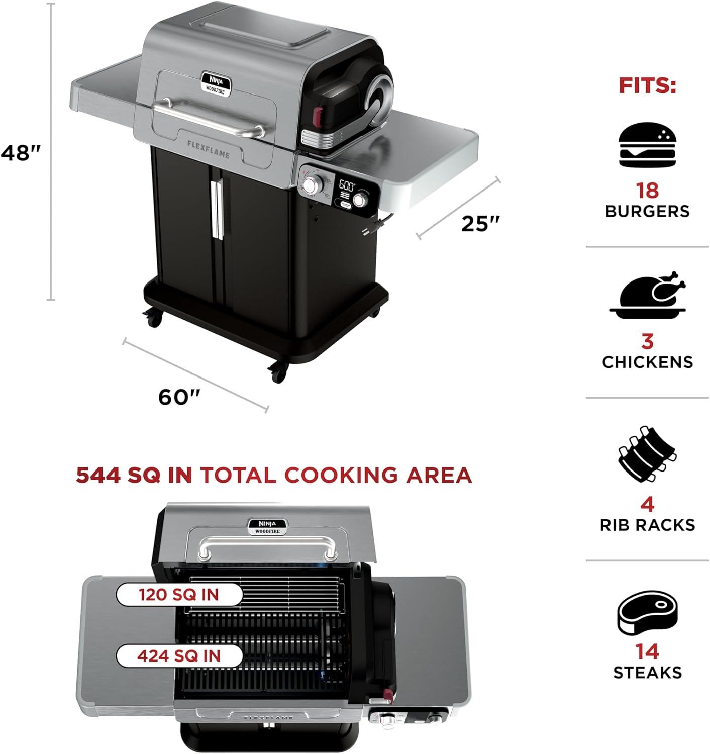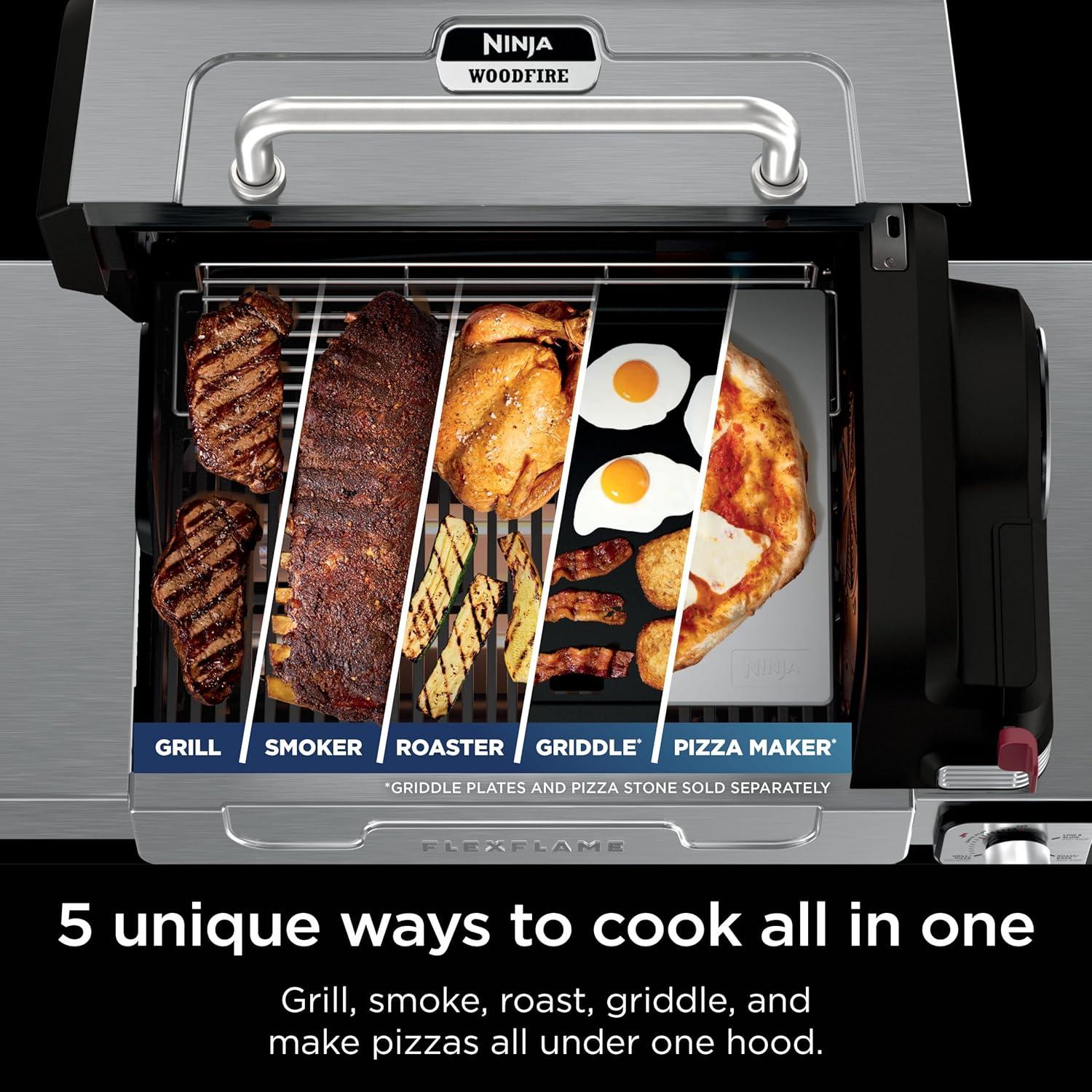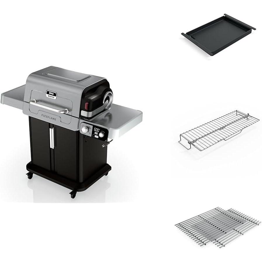 Meet the Ninja FlexFlame Outdoor Cooking System, Master Bundle. The all-in-one revolutionary appliance that allows you to cook 5 unique ways with zero compromises—grill, smoke, roast, griddle, and make perfect pizzas all in one outdoor system. Plus—with CyclonicHeat-iQ—rapid convection heat, propane flames, and authentic smoky flavors combine to give you faster* cooking and more versatility. *vs. Weber Genesis
