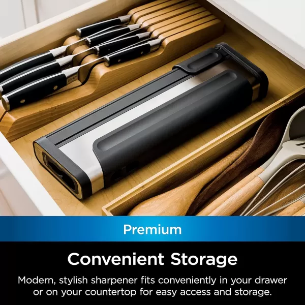 CONVENIENT STORAGE: Modern, stylish sharpener fits conveniently in your drawer or on your countertop for easy access and storage.